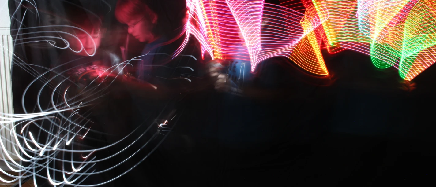 Wir beginnen mit Lightpainting: Dabei „malst“ du mit Taschenlampen oder Fahrradlichtern leuchtende Kunstwerke in die Luft. Eine Kamera hält diese Bewegungen fest und es entstehen beeindruckende Fotos, die wie echtes Lichtgraffiti aussehen.